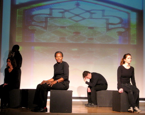 Lava Sus Manos by Jess Erick. Directed by Richard Manichello. From left to right, Femi Alou, Shelley Lerea, Tracey McAllister, Ryan Mallon, Mary Roberts.