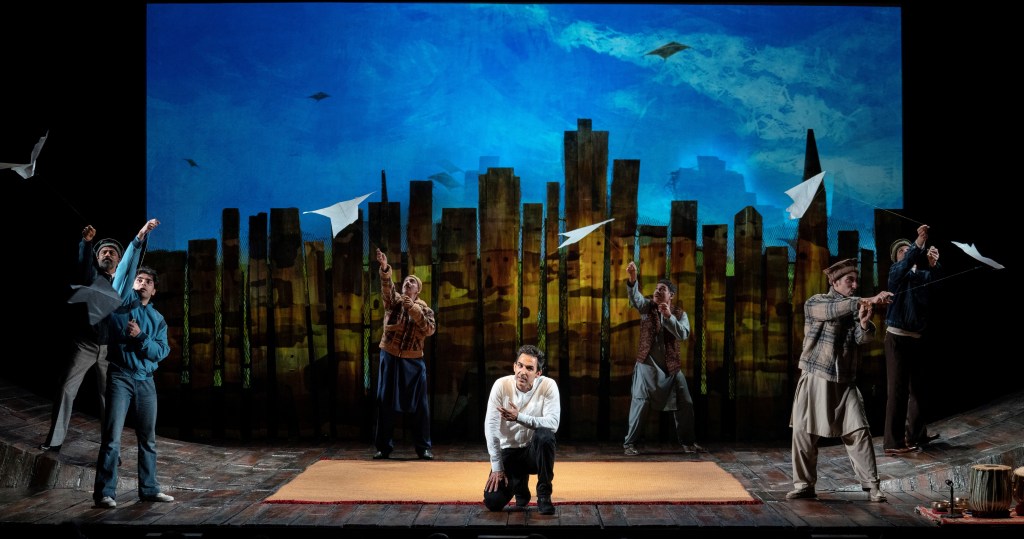 This imagistic, stylized production fades in and out of the epic in its cultural scope and breadth of events that take place between 1973 and 2001 in Afghanistan from monarchy, to republic, to communist coup, to Russian invasion, and Taliban takeover. Amir’s journey moves to Pakistan and San Francisco then back and forth again. With brief phrases of language at the beginning and sprinkled here and there, that reflect cultural authenticity, the fateful story emerges. Amir narrates and we witness vignettes that explore Amir’s evolution as a worthy human being. Arison does a yeoman’s job with a challenging role that spans decades and keeps him onstage until the intermission, then brings him back until the conclusion. With the music of the tabla drums, the singing bowls and the schwirrbogen, we find the rhythms of the culture always pulsating, to remind us of the vitality of history and ancestry.