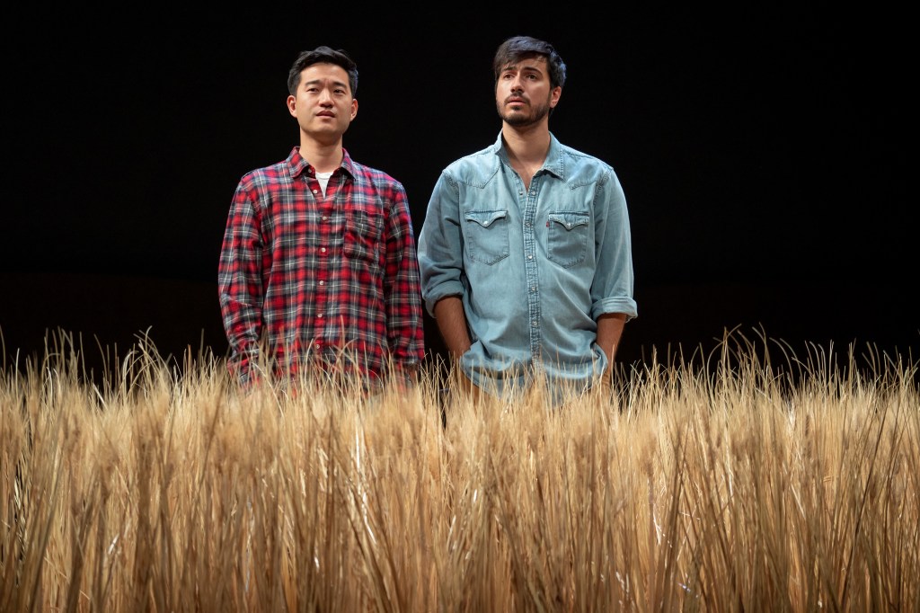 #1 makes it home. For him home is in a field of hay (though wheat might be more metaphorical). There he meets up with his brother Patrick, Character #5 (Dario Ladani Sanchez) who joins him holding a microphone. It is Patrick’s voice we have heard (in voice over) expressing #1’s interior thoughts throughout the play.