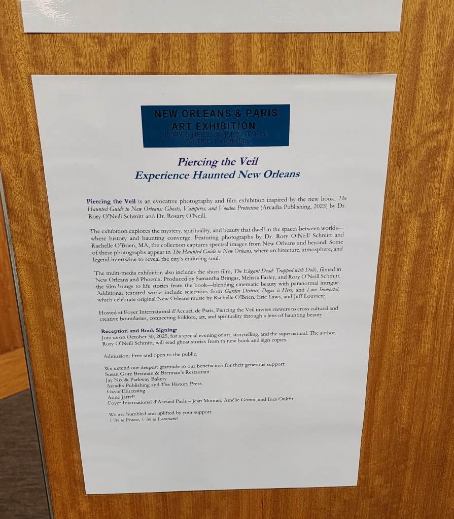 These were the photographs Rory, Amelie and the team had put up earlier in the week. Rory and sister Rachelle took the photographs of the various haunted buildings and New Orleans environs for The Haunted Guide to New Orleans. FIAP residents got to look at the photos since Monday. Now it was time for the formal opening of the exhibit.