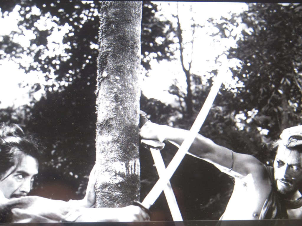 Kurosawa’s direction of the three players as the killer of the Samuri is powerful and to that their performances are sustained throughout. MIfune glares into the camera and shrieks out the story as the bandit Tajōmaru. He gleefully and wildly laughs taking pride in the murder, full of happiness that the wife (Machiko Kyō) gives herself to him on their first kiss. As he shakes and terrorizes he is brilliant and we understand how a woman might be mesmerized by his famous reputation as Tajōmaru the fierce bandit, attracted and repelled, but softened when he employs his powers of seduction. Mifune’s performance rises to the myth of Tajōmaru and electrifies as Kurasawa makes use of the straight-on camera shot of Mifune cross-legged, then close-ups of him flashing eyes and teeth to horrify and delight. No wonder this sterling performance captivated audiences globally then and now.