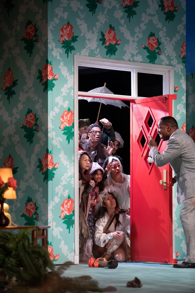 The production, one of spectacle and moment, whimsy and humor is acutely directed by Lileana Blain-Cruz for maximum effect. It succeeds in various instances, to be poignant and profound as the Antrobus family (James Vincent Meredith-Dad, Roslyn Ruff-Mom, Julian Robertson-Henry, Paige Gilbert-Gladys) and their maid Sabina (Gabby Beans), the narrator who breaks the fourth wall to address the audience, claw their way through history to survive. These “every men” and “every women” archetypes experience representative cataclysms, all the while confronting the questions about the human race and their place in history until the end of time.