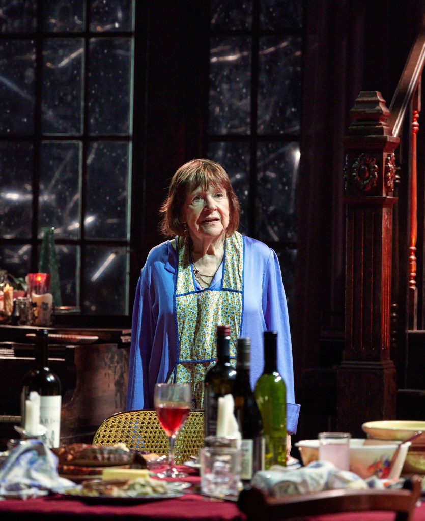 In the shaking and weird roaring noise that lasts a few seconds at the top of the play, we have a chance to peruse Morkan’s (Marylouise Burke) expansive, circular, den-dining room in her idyllic, barn-like mansion somewhere in the woods near a river. The place has been renovated and repainted, long-time friend Ames (the wonderful Jonathan Hadary) reveals during the course of the evening. Two large floor to ceiling windows are set equidistant to the right and left of the central staircase. They look out on an immense tangle of dark, surreal tree limbs and bushes upon which snow falls but never sticks. John Lee Beatty’s set is a magnificent throwback to a former Americana of dark, rich, wood paneled loveliness whose central point is three staircases: one short leap of stairs from the entrance opening onto the main floor, and two massive staircases leading to the second story presumably of bedrooms and a bathroom with a novel Japanese toilet that Freddy (C.J. Wilson) admires.