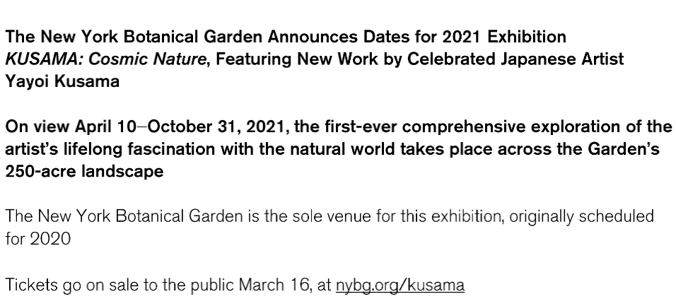 The New York Botanical Garden is presenting its expansive 2021 exhibition, KUSAMA: Cosmic Nature. The internationally celebrated Japanese artist Yayoi Kusama is being featured for the Spring season since the exhibit was postponed in 2020 because of the COVID-19 pandemic. The exhibition includes four experiences that will debut at the Garden which is the exclusive venue for KUSAMA: Cosmic Nature. The exhibition will be installed across NYBG’s landscape, in and around the Enid A. Haupt Conservatory, and in the LuEsther T. Mertz Library Building. Timed, limited-capacity tickets for the landmark presentation go on sale to the public March 16, 2021, at https://www.nybg.org/event/kusama/