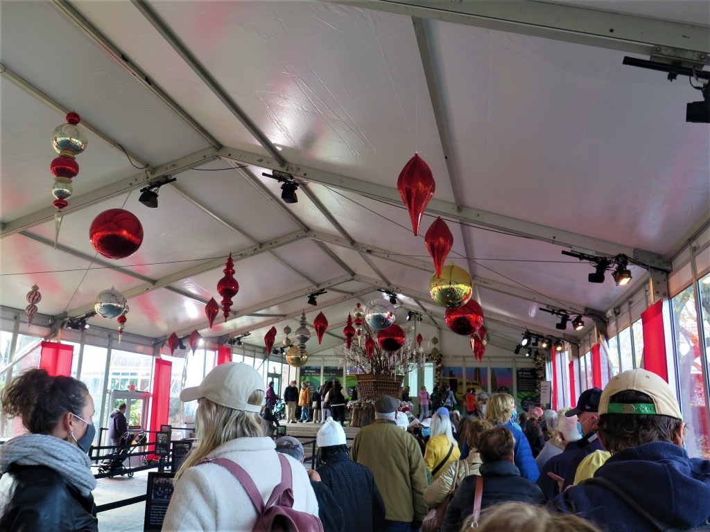During the 23 special, select evenings, the Garden’s buildings, including the LuEsther T. Mertz Library Building become dramatic, striking pageantry. The Garden’s creative teams have dispersed thousands of lights (energy-efficient) in choreographed displays to twinkle and beckon to visitors throughout the landscape. The light production accompanied by a selection of music is designed to lighten New Yorkers’ hearts with a celebratory spirit of thankfulness. The botanical creators have captured beauty in their demonstrated love and talented artistry exercised in the service of joy and uplift for the 2022 winter season that is not under previous extreme duress of the pandemic that we’ve suffered through these past three years. However, if one feels to, though vaccination cards will not be checked, one may comfortably wear a mask in the Conservatory and when not eating in the Hudson Garden Grill and the Pine Tree Cafe.