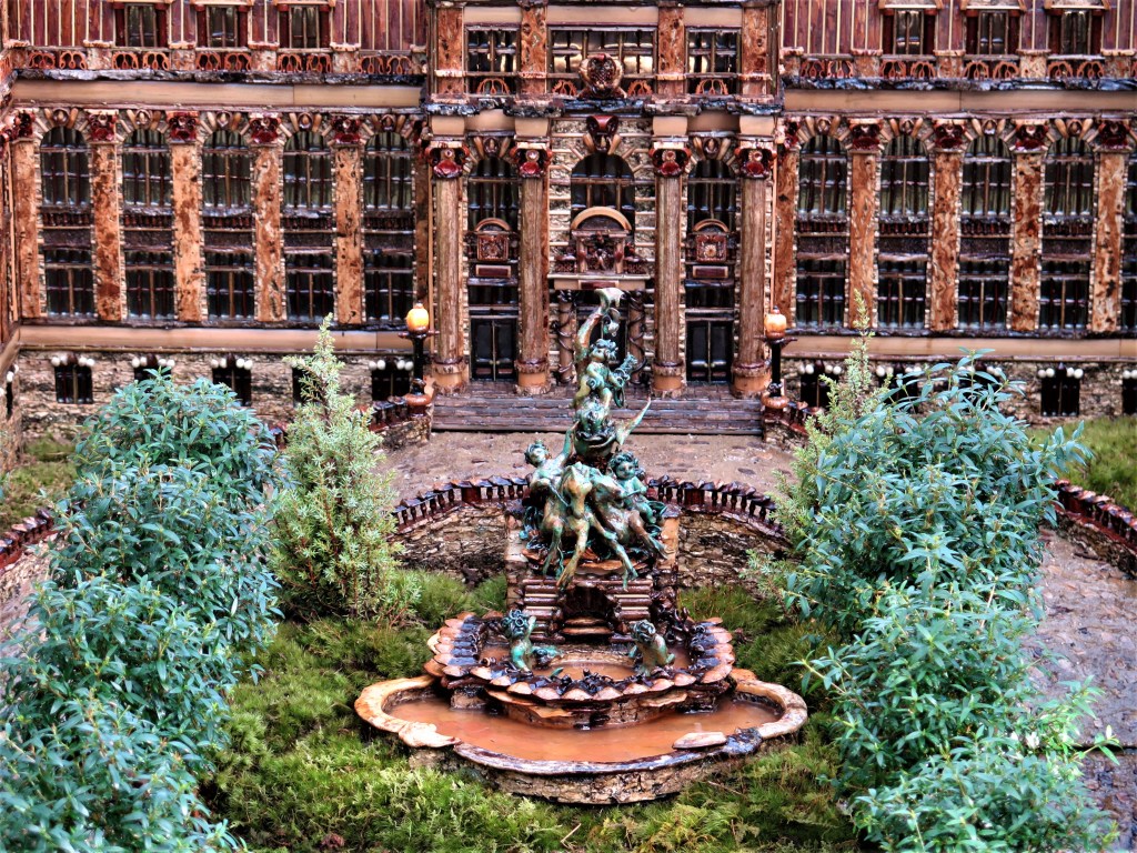 In celebration of the NYBG Holiday Train Show’s 30th year, the creative team at Applied Imagination re-created one of the central aspects of the Garden: the LuEsther T. Mertz Library Building with the Lillian Goldman Fountain of Life, and the John J. Hoffee Tulip Tree Allee. These buildings and attendant features were declared a New York City Landmark in 2009. The care and effort taken to manifest these structures took thousands of hours of work. Take a moment to appreciate the designs and materials used to create the display. Especially appreciate the myrtle topiaries that simulate the Tulip Tree Allee.