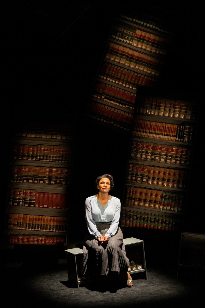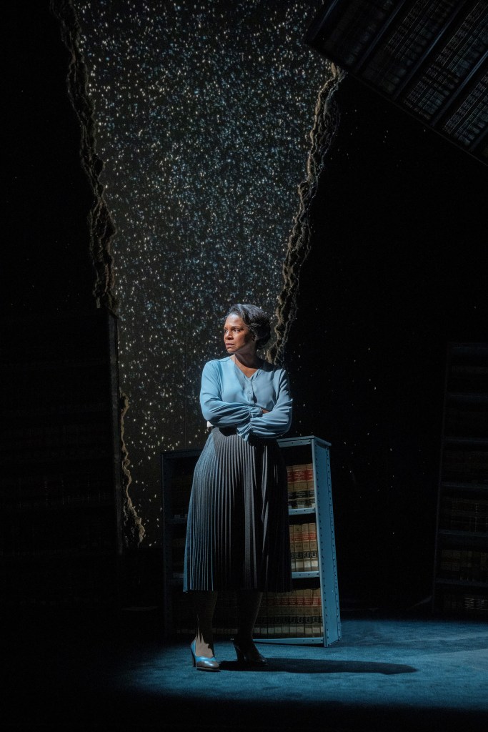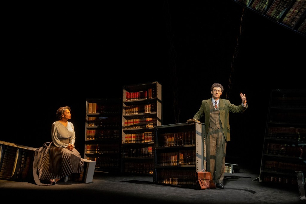 Kenny Leon’s vision complements Kennedy’s play. It is imagistic, minimalistic and surreal, thanks to Beowulf Boritt’s scenic design, Jeff Sugg’s projection design, Allen Lee Hughes lighting design and Justin Ellington’s sound design. At the top of the play there are two worlds. We see black and white projections of of WWII and the aftermath through a v-shaped crevasse that divides the outside culture and the interior of the college in the library symbolized by faux book cases. These are suspended in the air and move around symbolically following what Suzanne discusses and describes.