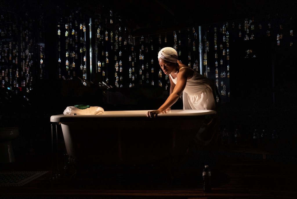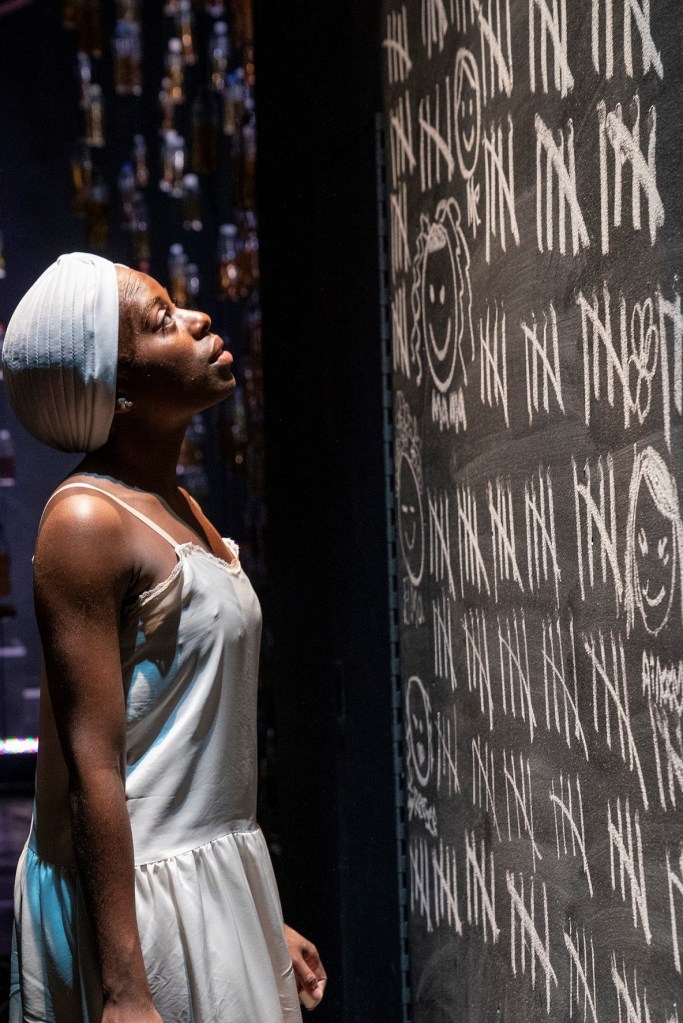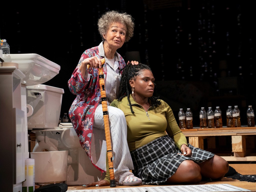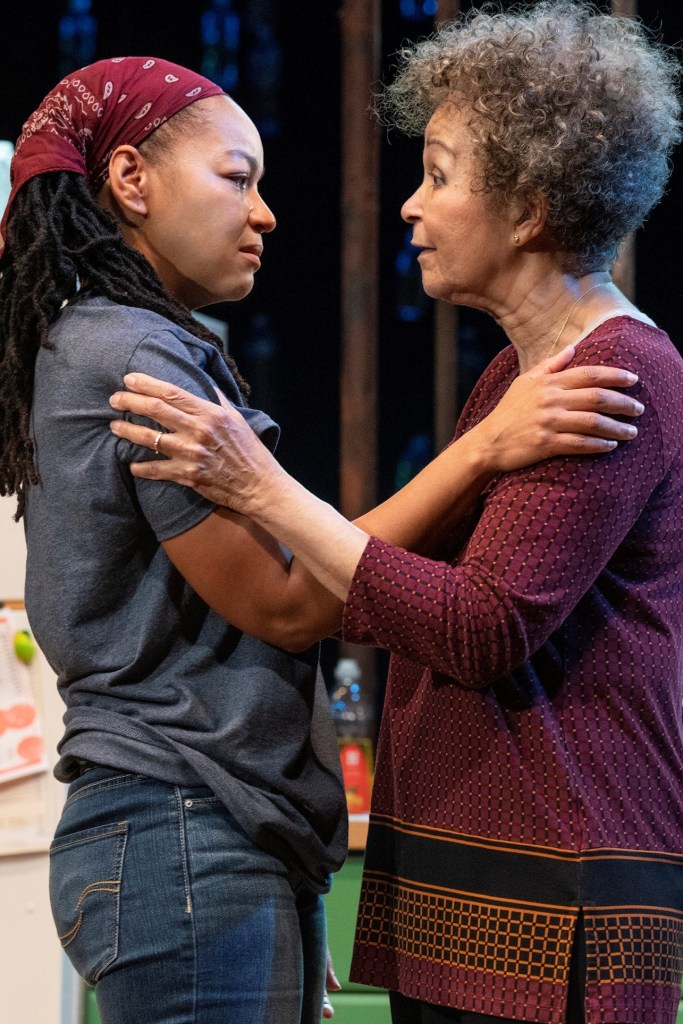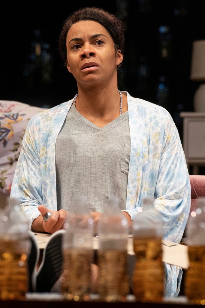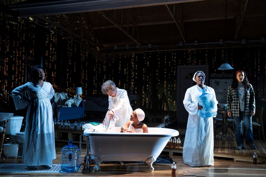 The playwright’s details about the bottles of water required to wash vegetables, the turkey and trimmings for Thanksgiving dinner, the water needed to clean and take care of their daily needs is a staggering reminder of how much water we use in our lives. Wherever you turn in the theater, you see the reminder of the importance of clean water via Adam Rigg’s wonderful set design. Through Plum, who is dying because of the corrupted water, we note the numbers. At the play’s beginning, she chalks off the days Flint’s water supply has been corrupted since 2014: it is in the thousands surrounding the walls of the theater. On sides of the stage, Riggs has suspended bottles of water hanging down against the walls. It looks clean, but is it? The stage is filled with bottles of yellow, toxic water that the women label as a record that their water supply is still contaminated.