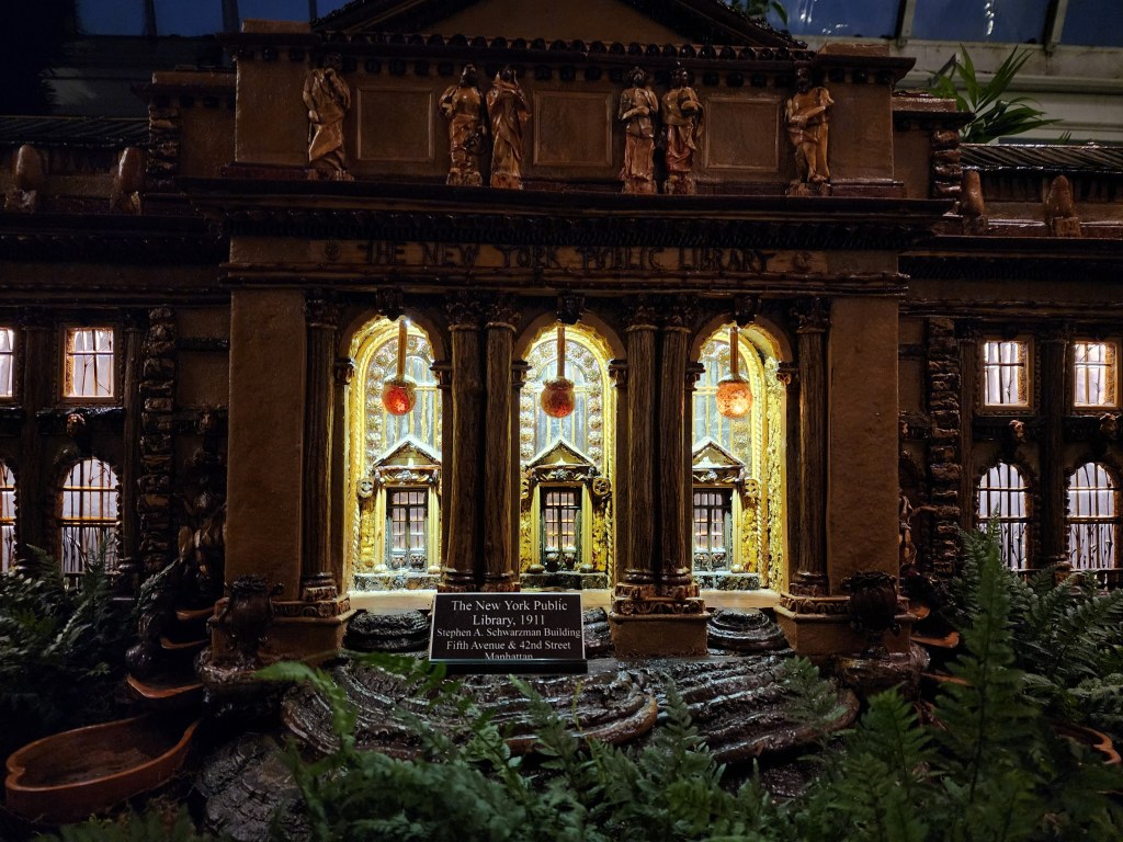 New York Public Library replica, NYBG Holiday Train Show 2018, Applied Imagination (Carole Di Tosti)