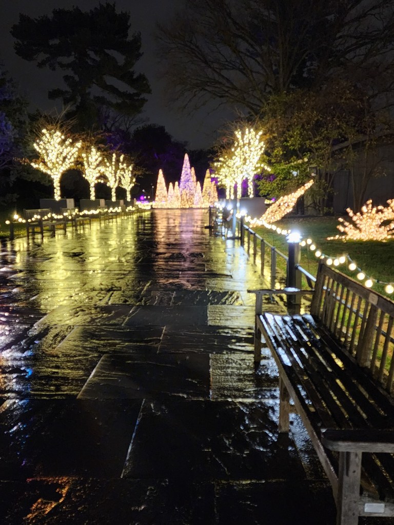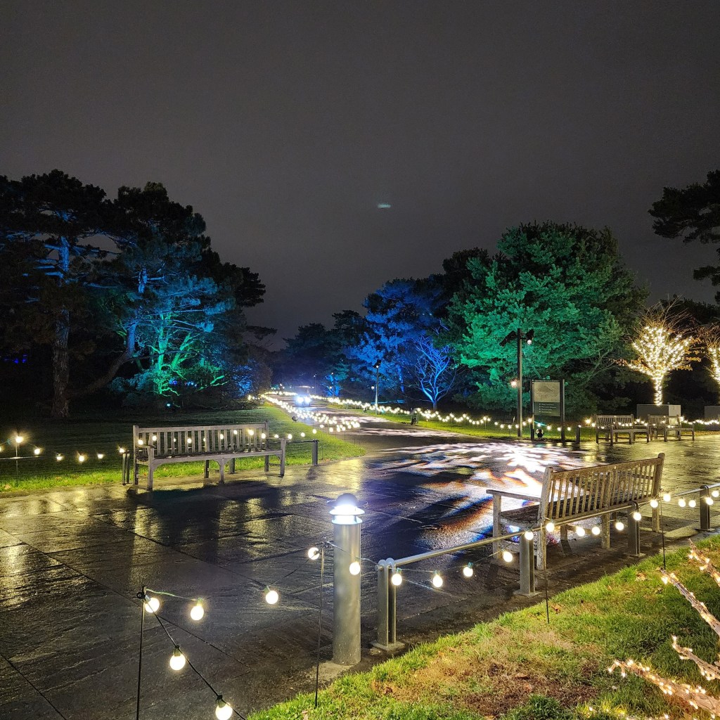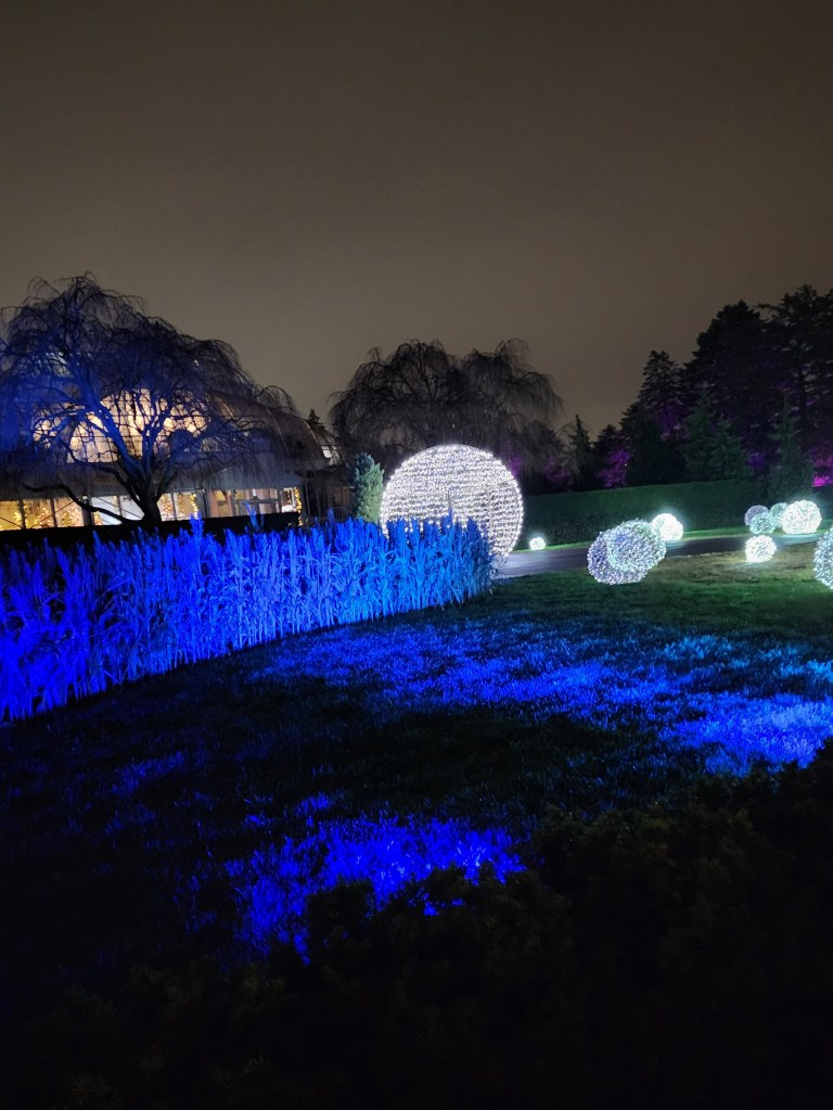 During the 23 special, select evenings, the Garden’s buildings, including the LuEsther T. Mertz Library Building become dramatic, striking pageantry. The Garden’s creative teams have dispersed thousands of lights (energy-efficient) in choreographed displays to twinkle and beckon to visitors throughout the landscape. The light production accompanied by a selection of music is designed to lighten New Yorkers’ hearts with a celebratory spirit of thankfulness. The botanical creators have captured beauty in their demonstrated love and talented artistry exercised in the service of joy and uplift for the 2022 winter season that is not under previous extreme duress of the pandemic that we’ve suffered through these past three years. However, if one feels to, though vaccination cards will not be checked, one may comfortably wear a mask in the Conservatory and when not eating in the Hudson Garden Grill and the Pine Tree Cafe.