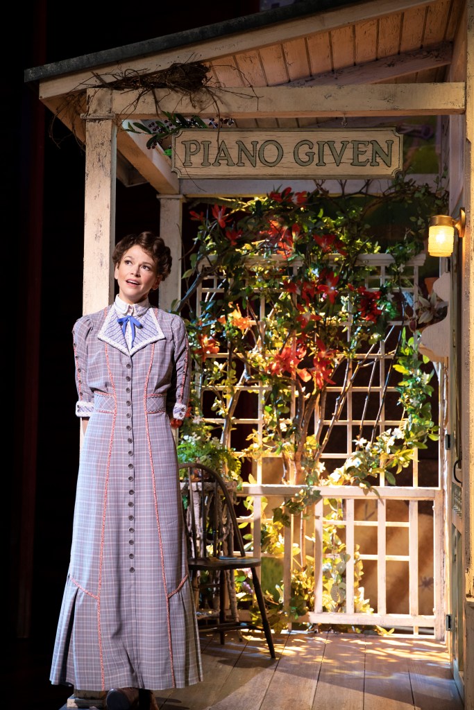Marian’s costumes are straight-laced without frills by comparison; her hair (Luc Verschueren for Campbell Young Associates), like the other ladies is in fashion, an up-sweep like her mother’s, Mrs. Paroo (the wonderful Maureen Mullen). Attention in this detailed crafting reveals Marian’s restraint, her career and character, providing the subtext and interesting contrast to the other open-handed, more extravagantly dressed woman. Eulalie and her hens are encouraged to believe in themselves in Hill’s sincere admiration as they ooze his charm back at him and titter. In the case of Marian’s response to Hill’s starlight, she moves from grimace to smile to grin.