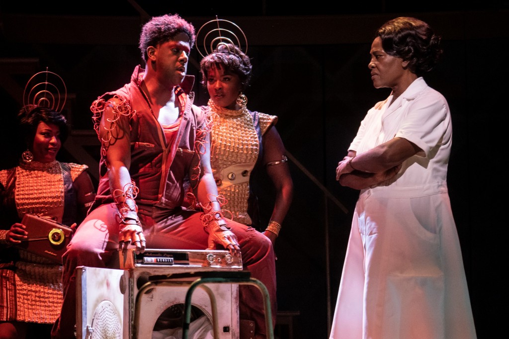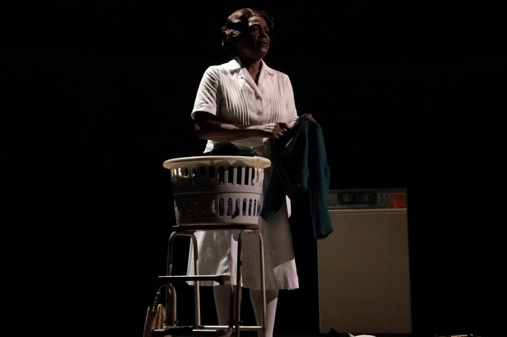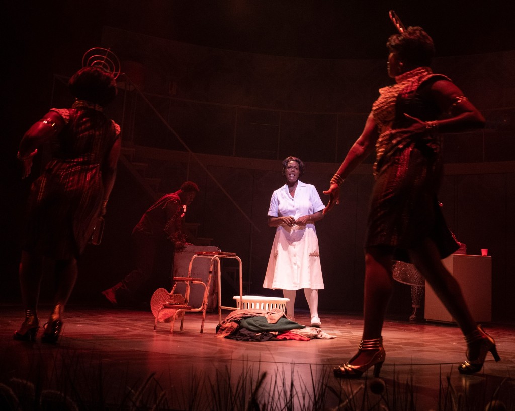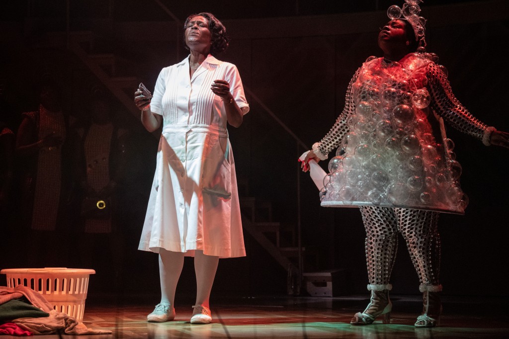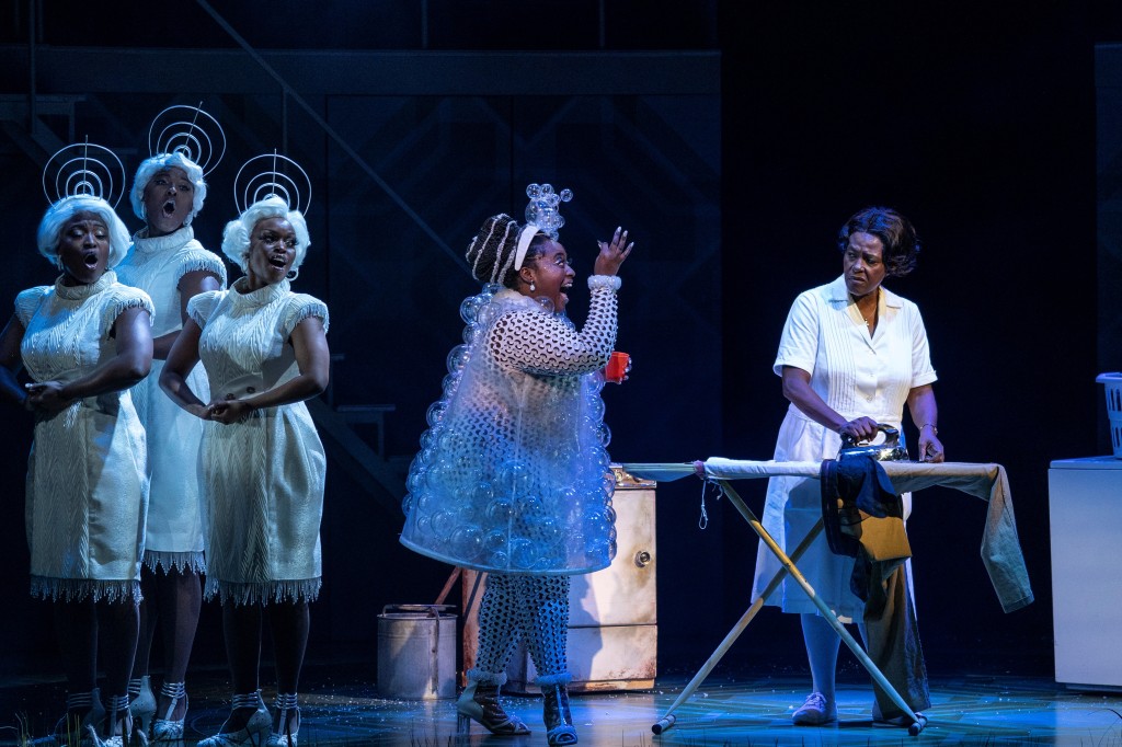 “Sixteen feet below sea level, torn tween the Devil and the muddy brown sea,” Caroline (the terrific Sharon D Clarke) characterizes her existence to herself in the musical revival Caroline, or Change at Studio 54. At the outset Caroline is in the basement doing the laundry for the Gellmans accompanied by the rhythms of The Washing Machine (Arica Jackson) and The Radio singers #1, #2, #3 (Nasia Thomas, NYA, Harper Miles). They are anthropomorphic representations of Caroline, along with The Dryer (Kevin S. McAllister) who makes the atmosphere as “hot as hell.”