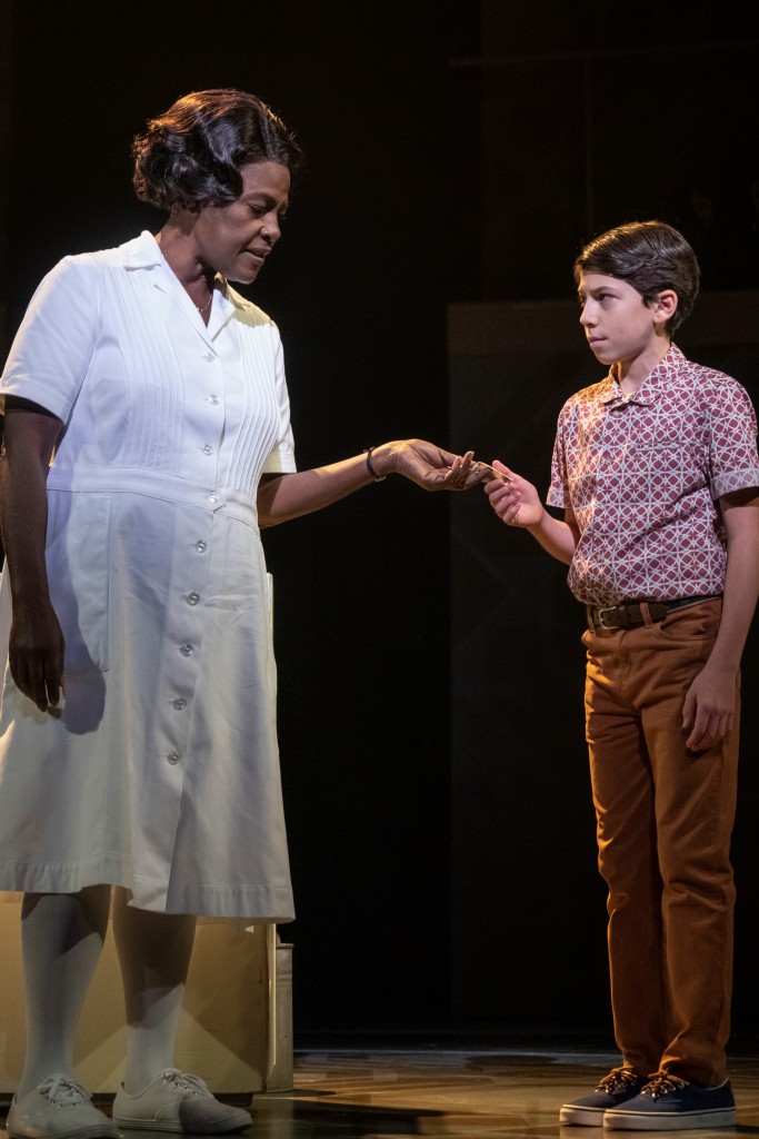 The superb cast is up for the challenge, singing beautifully, powerfully. Initially, it took me a while to understand the lyrics; the performers’ articulation wasn’t as acute as needed. However, like getting used to Shakespearean language, the heightened bond between the cast and the audience conveyed the centrality of Caroline’s conflicts. These become “a matter of ethics,” pride and dignity for her as a black woman who must carve out her identity in a bludgeoning, challenging racist society. What Kushner fashions as an issue of nickels and dimes evolves into the crux of black economic experience in the U.S, then and now.