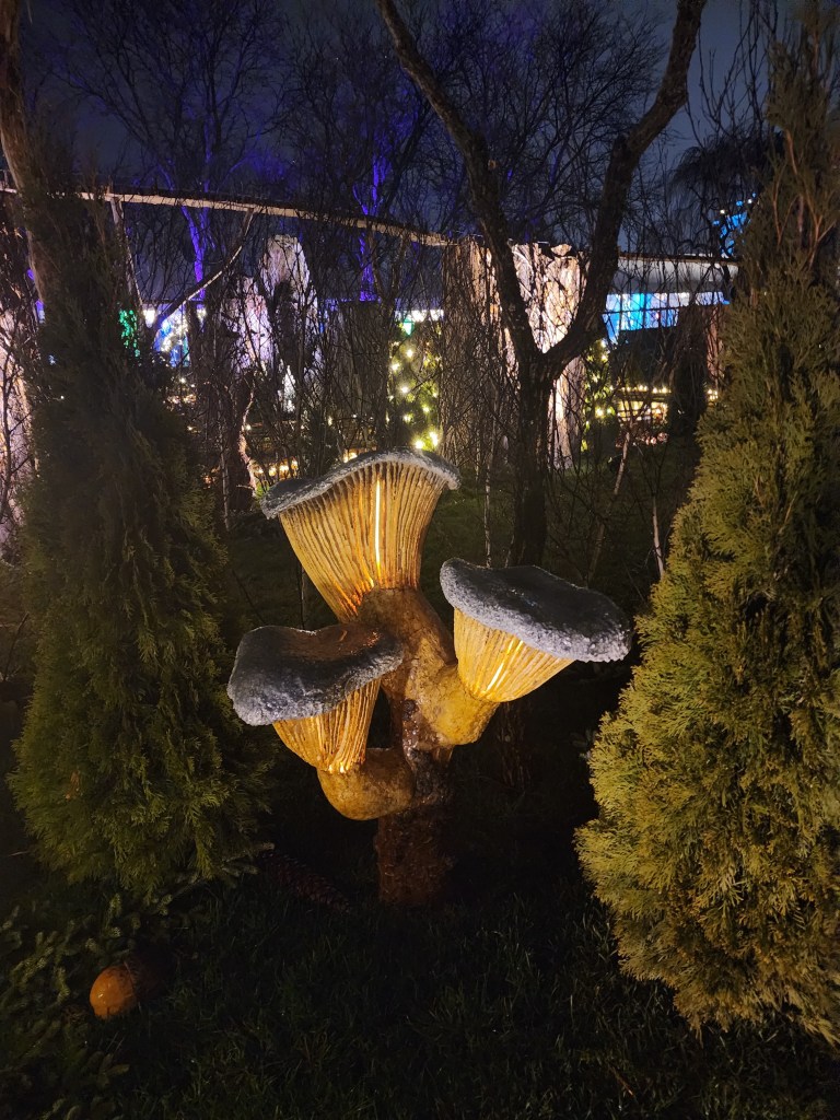 In the outdoor landscape, the toadstools and fungi that appear to be ceramic and plucked out of a Disney animation are actually carved wood finely shaped, shaved and smoothed, then painted cheerfully to shine a glossy surface. The detail of the fungi is mind-boggling and realistic. One can spend an hour taking in the near atomized work of the craftspeople whose creations are at the quality level of art. Look for animals, snails, the owl (made of artichokes) and other woodland creatures.