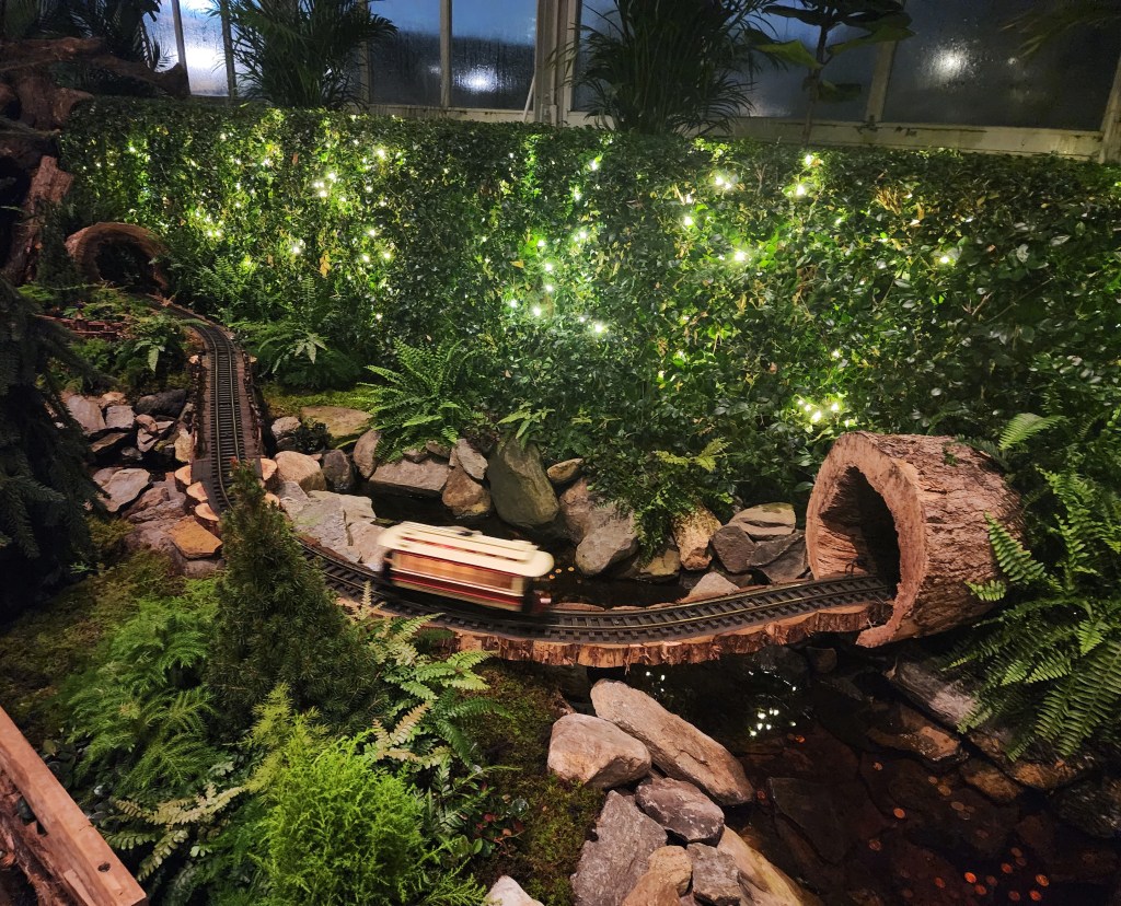 This year’s Train Show is fabulous and bigger than ever with more model trains and an “all-new outdoor display,” that is a magical woodland of fantastic fungi and creatures. Various slow and fast moving trains zip along merrily on raised trestles and around mountain landscapes on the Haupt Conservatory Lawn..